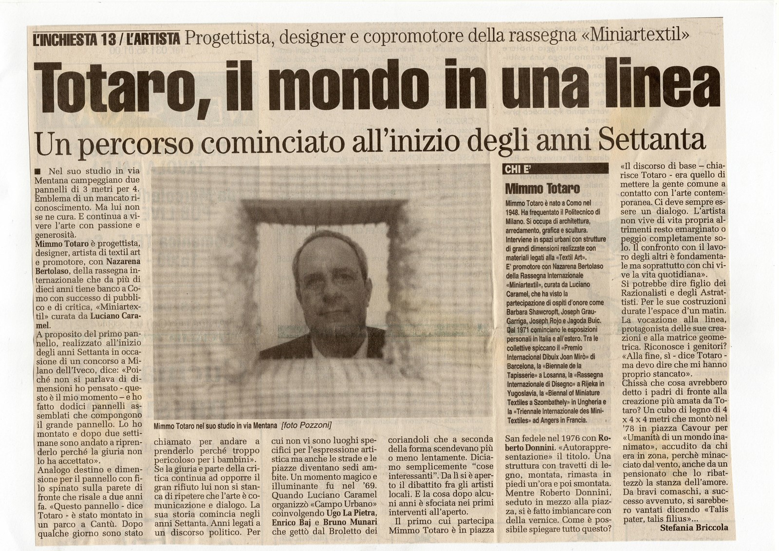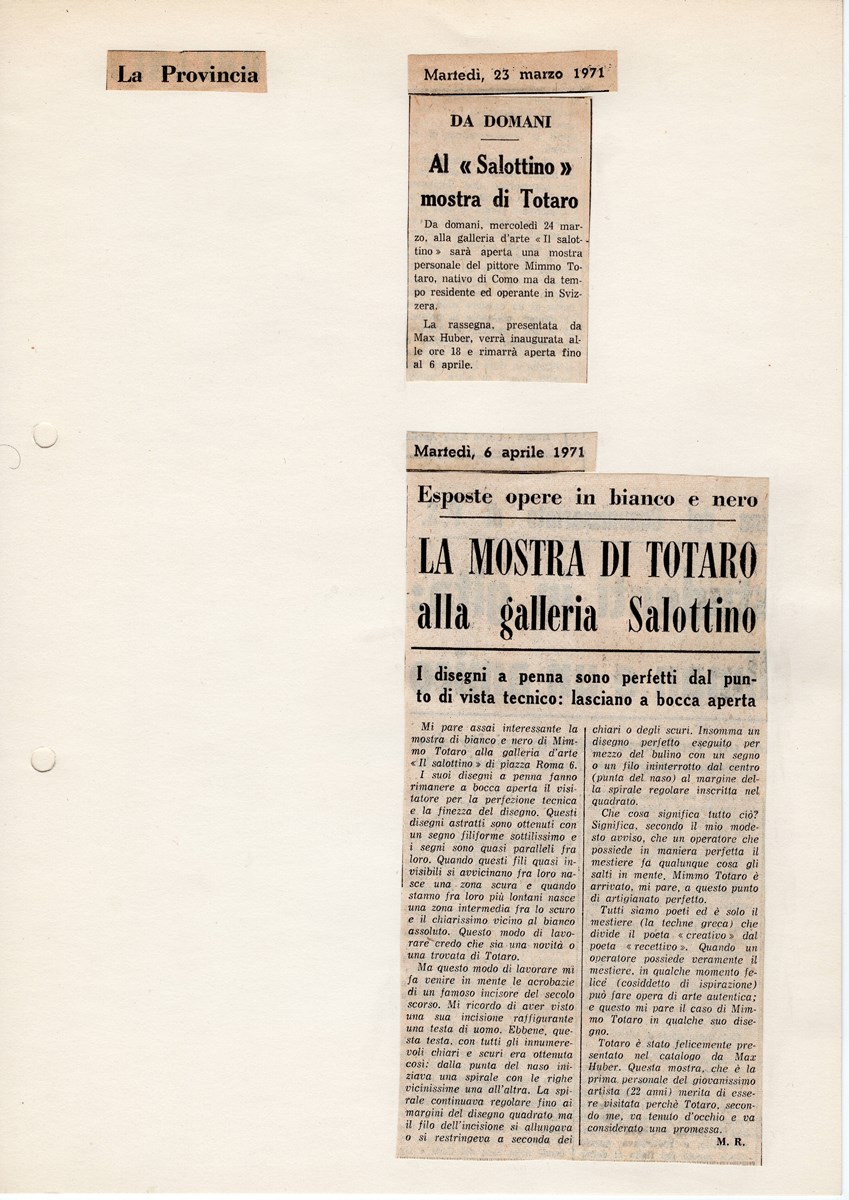 Tre anni fa ho ricensito la prima personale di Mimmo Totaro alla galleria «Salotto» di Como; in quell’occasione ho scritto che il visitatore rimaneva a bocca aperta davanti alla perfezione tecnica delle opere in bianco e nero esposte...