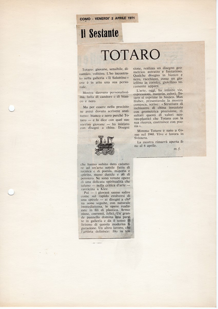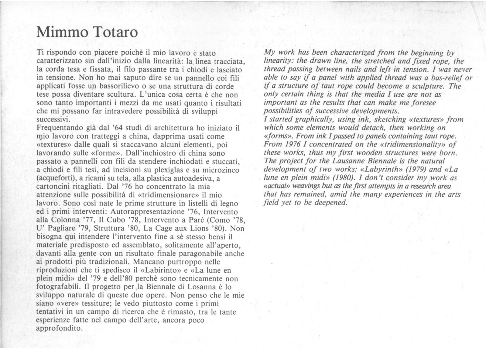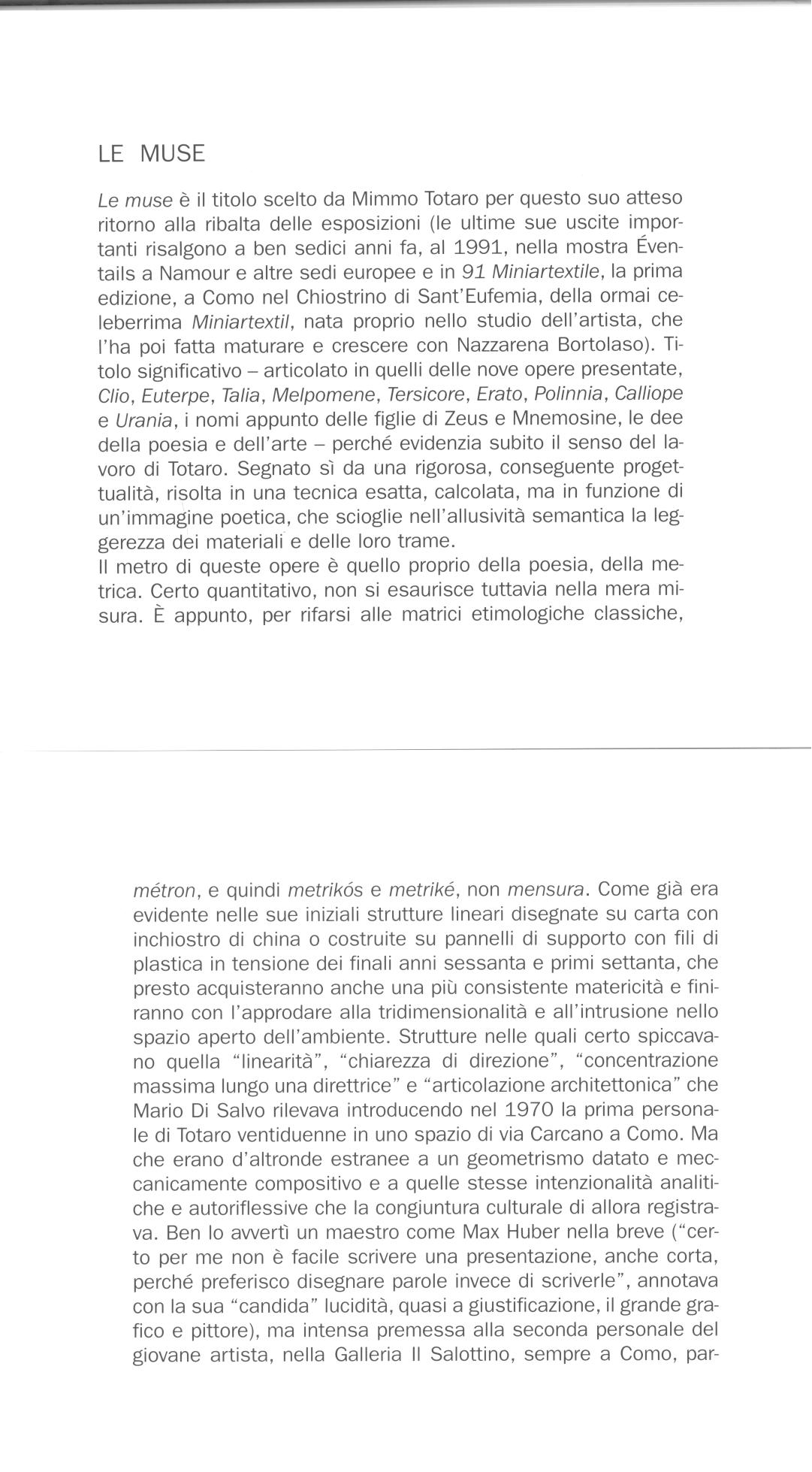 La linearità caratterizza la ricerca di Totaro: non solo come manifestazione compositiva, anche come condotta. Linearità significa chiarezza di direzione, in quanto non distratta da varie dispersioni: concentrazione massima lungo una direttrice...