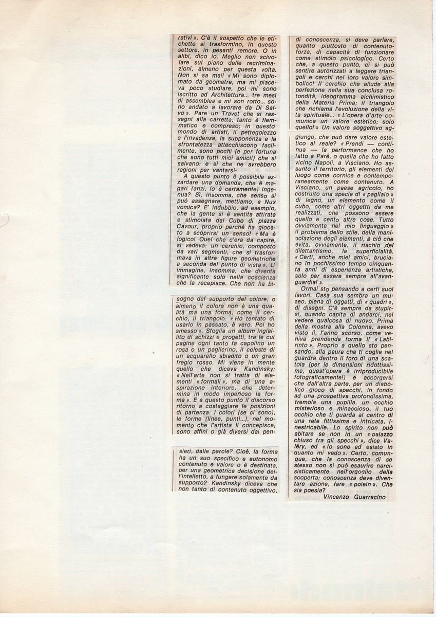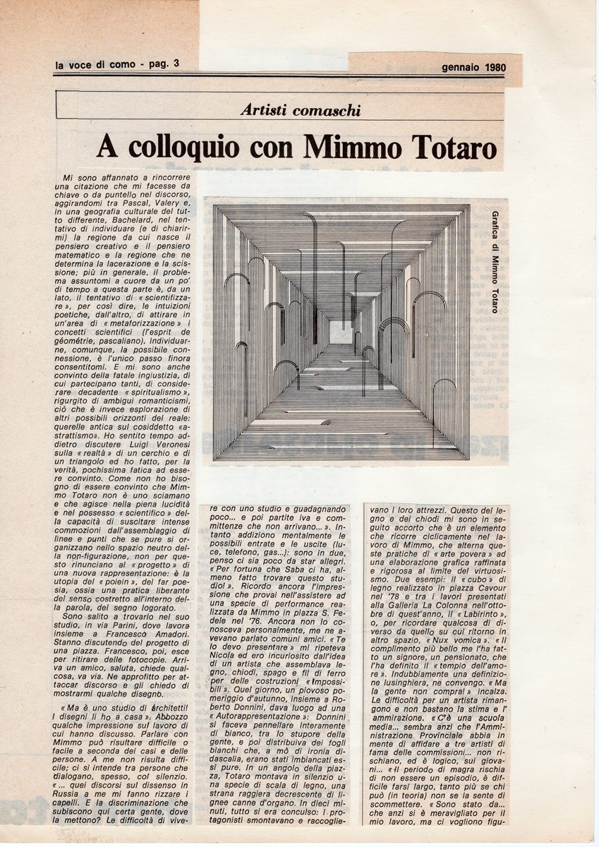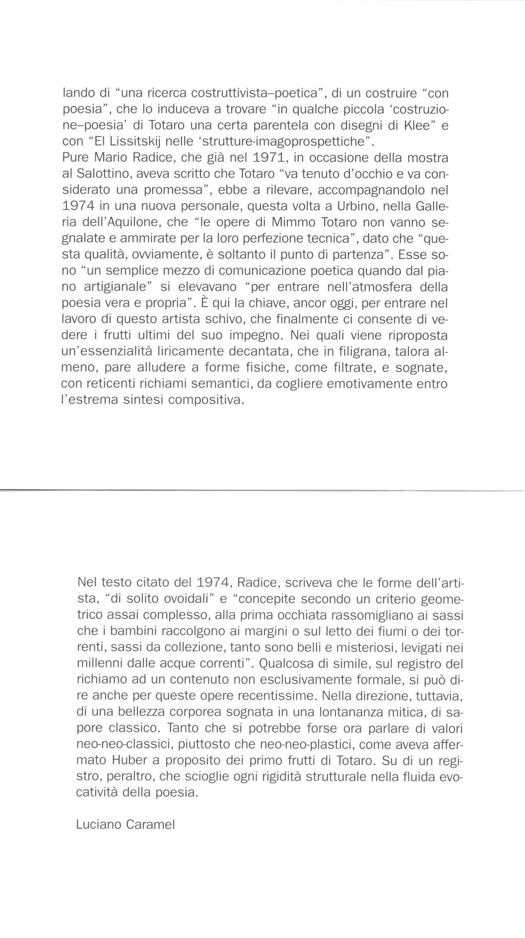 Alcuni anni adietro ho presentato Mimmo Totaro con la parola costruttivista facendo esempio di una certa parentela lontana con el Lissitzky. “Neo-costruttivista” giovane, Mimmo presentava disegni in bianco-nero di una sua precisa concezione personale...